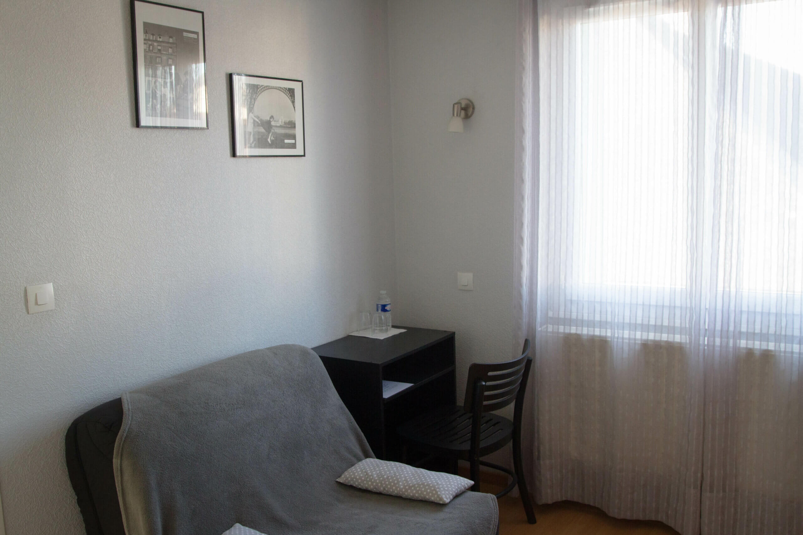 Lit double de 160cm, fauteuil convertible,  salle d’eau et wc privatifs.